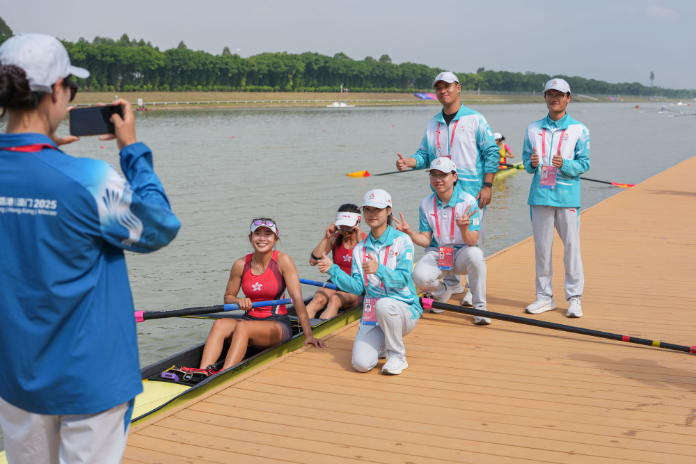 11月8日,香港队赛艇选手黄湘仪/梁琼允在女子双人单桨半决赛后与志愿者合影留念。新华社记者 肖恩楠 摄