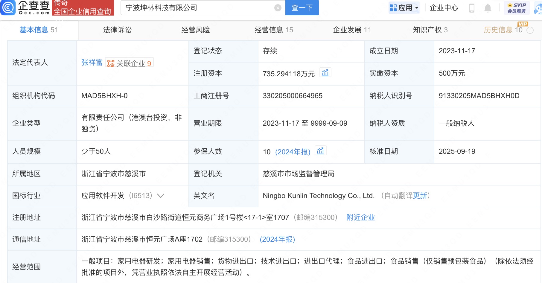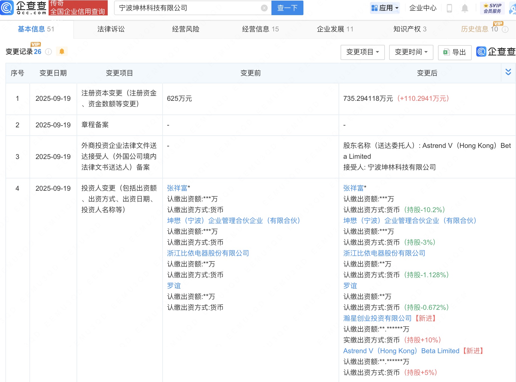 近日,宁波坤林科技有限公司发生工商变更,新增小米旗下瀚星创业投资有限公司、AstrendV(HongKong)BetaLimited为股东,注册资本由625万人民币增至约735万人民币,同时主要人员发生变更。企查查信息显示,该公司成立于2023年,法定代表人为张祥富华城融,经营范围包括家用电器研发、家用电器销售等。